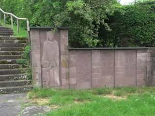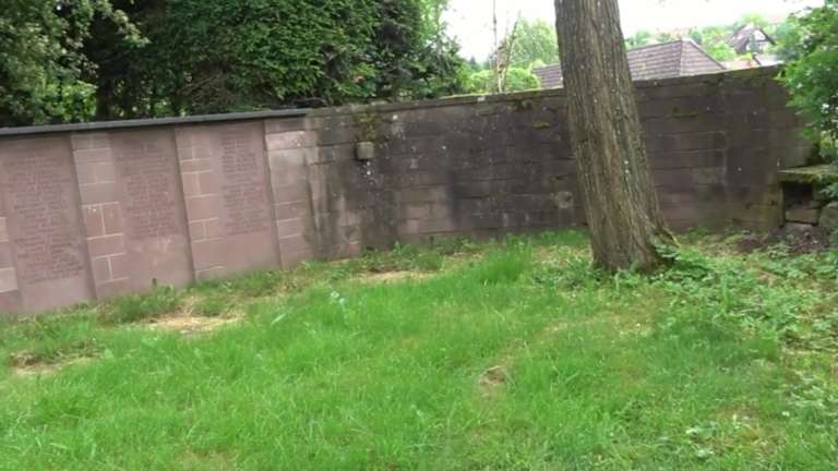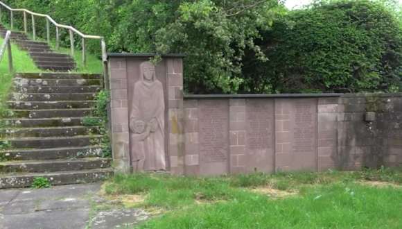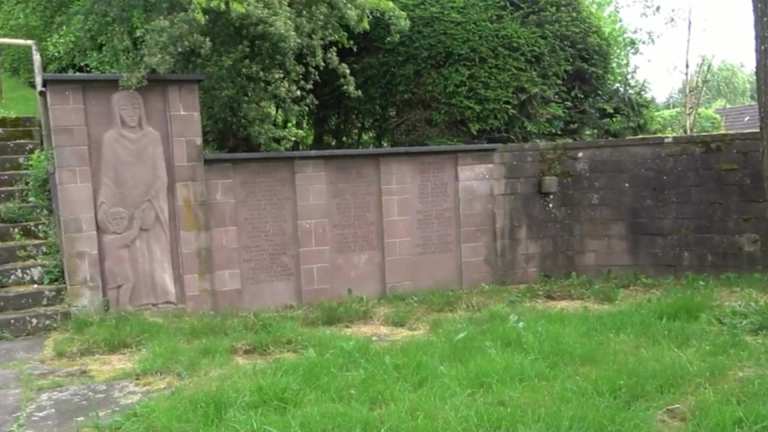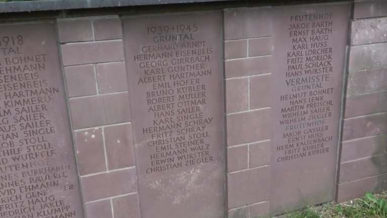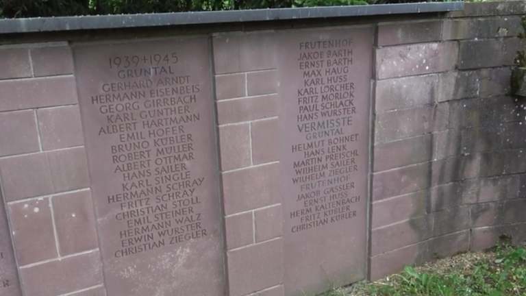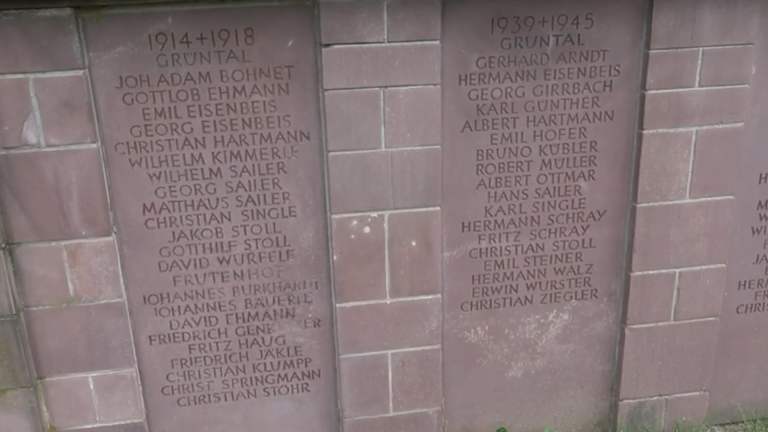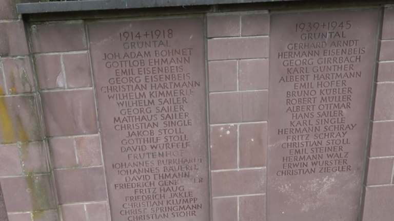 Oberhalb der Kirche, am Treppenaufgang zum Friedhof, befindet sich rechter Hand ein Kriegerdenkmal. An einer roten Bundsandsteinmauer steht eine Mutter mit Kind. Rechts von ihr sind drei Tafeln, ebenfalls aus Bundsandstein, mit eingravierten Namen der Gefallenen beider Weltkriege. Adresse: Grüntal,72250 Freudenstadt Geodaten: FFJ9+27J Freudenstadt