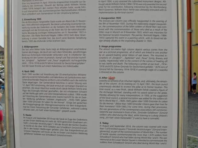 In Schwäbisch-Gmünd hat man jetzt das ehemalige Denkmal für die gefallenen Soldaten des 1. WK auf dem unteren Marktplatz aufgestellt und einen Fragekatalog daneben aufgestellt, ob man dieses Denkmal nicht auch für die Soldaten des II. WK betrachten kann. Ich denke mir, daß ist sehr wohl möglich. Die Soldaten des Kriegs von 1914 bis 1918 sind zwar mit "HURRA" Geschrei in den Krieg gegangen, für diese Begeisterung waren die Kaiser und die Militärs und die damalige Zeit verantwortlich, Ich sage aber, die jungen Soldaten waren genau wie die Soldaten des II. WK. von Verbrechern in einen Krieg geschickt worden, um den persönlichen Hass der damaligen Herrscher auf andere Völker zu befreidigen und ihre Großmannssucht der Welt zu zeigen. Ich persönlich denke voll Grauen an solche Zeiten zurück, wie gut,daß wir in Europa so etwas nicht mehr erleben werden.