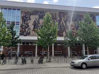 Nördlich vom Altmarkt befindet sich der Kulturpalast von Dresden, der im Jahr 1969 eröffnet wurde. Nach umfangreichen Renovierungen und Umbaumaßnahmen erfolgte 2017 die Neueröffnung. Ich finde es gut und wichtig, dass der Kulturpalast von Dresden erhalten blieb und so an die DDR-Kultur erinnert (leider wurden viele andere DDR-Bauten abgerissen, wie z.B. der Kulturpalast von Berlin, der nun durch eine fragwürdige Rekonstruktion des Berliner Stadtschlosses ersetzt wird). Der Kulturpalast von Dresden ist ein rechteckiger Bau mit Glasfassade und dem großen Wandbild „Der Weg der roten Fahne“ an der West-Fassade (Außenwand Richtung Schloßstraße).
