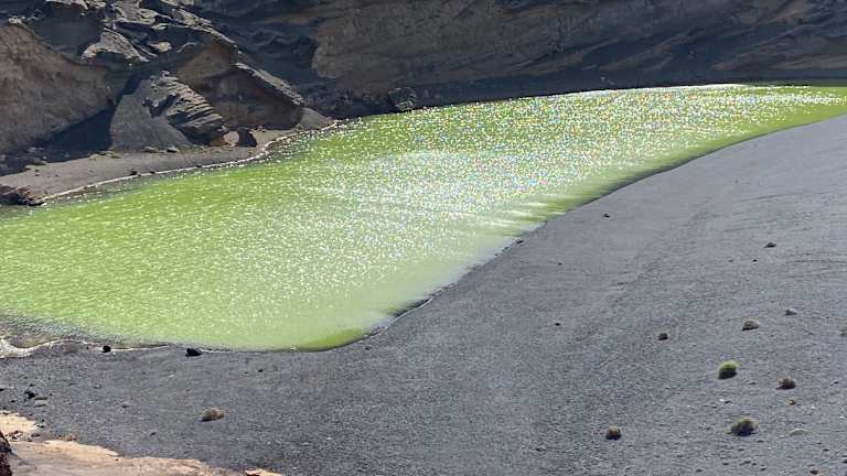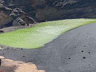 Südlich des kleinen Fischer-dörfchens El Golfo befindet sich eine der bekanntesten Sehens-würdigkeiten der Insel. Am Boden eines teilweise im Meer versunkenen Vulkankraters hat sich hier eine Lagune gebildet. Die markante grüne Farbe wird dem "Lago Verde" durch Algen gegeben. Besonders sehens-wert ist das Farbenspiel von grüner Lagune, rotem Lavafels und den ockergelben Gesteins-strukturen der Kraterwand. Das Naturschauspiel erreicht man von einem großen Parkplatz am Ortseingang von El Golfo über einen schmalen Pfad im roten Lavafels. Von einem Plateau aus bietet sich ein grandioser Ausblick. Der Abstieg zur Lagune ist verboten und abgesperrt. Bequemer erreicht man die Lagune vom Parkplatz an der Südseite des Kraters. Ein Weg führt bis zum schwarzen Sandstrand und zur grünen Lagune "Charco de los Clicos". Der extrem hohe Salzgehalt bietet ideale Lebensbedingungen für die Algen. Am schwarzen Strand sind auffallend viele Leute mit gesenktem Blick zu sehen. Der Grund dafür ist die Suche nach Olivin, einem Halbedelstein. http://www.lanzarote-virtuell.de/lanzarote_2/orte/lagoverde.htm
