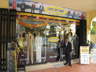 Dieser Schneider, eine nepalesische Familie, hat ihr Ladengeschäft in der gehobenen und architektonisch ansprechenden Einkaufsplazza des 4 Sterne Buddy Boutique Hotels am nördlichen Ortseingang von Lamai. Wir haben uns davon überzeugt das - wie bei wenigen Schneidern auf Samui - hier noch qualitativ sehr gute Handarbeit geleistet wird ( keine Factoryherstellung ! ) Nach 3 bis 4 Anproben in zwei bis drei Tagen passten Anzüge aus italienischen Super 150 und Cashmire, Kleider aus feinster Seide perfekt. Preise zwischen 70 und 140 Euro oder 12 Euro für ein Anzughemd mögen zwar nicht die billigsten auf Samui sein, aber dies wollten wir auch nicht sondern topp Qualität wie wir sie aus Mailand kennen ( nur viel preiswerter ) und die haben wir ohne aufdringliches "Schönreden" von Mr. Win erhalten. Absolut empfehlenswert - aber überzeugen Sie sich selbst.