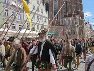 Ein alle 4 jahre großes mittelalterliches Schauspiel von 1475, der Einzug der polnischen Braut Hedwig, Tochter des polnischen Königs Kasimir IV. war mit 1200 Gefolgsleuten in eienem Tros und 640 Pferden und Planwagen monatelang von Krakau nach Landshut zur Hochzeit gezogen, wohl das größte mittelalterliches Schauspiel in Europa, das vom 30.06.-23.07.2017 statt findet, die Hochzeit soll 60.000 Gulden = 12 Millionen € gekostet haben. Der Bayernherzog Ludwig der Reiche war der künftige Mann, überweigend politische Gründe hatet die Hochzeit. Eine Woche lang hielt man die das Volk frei. Der Reichtum stammte aus ertrgreicher Landwirtschaft, Salzhandel und Kupfergewinnung. Heute nehmen 2400 Bewohner aktiv teil. Am Sonntag ist der Andrang am größten über 100.000 Zuschauer verteilen sich in der Altstadt und Burganlage, man sollte schon früh da sein um einen guten Platz zu finden. siehe: www. landshuter-hochzeit-tikets. de