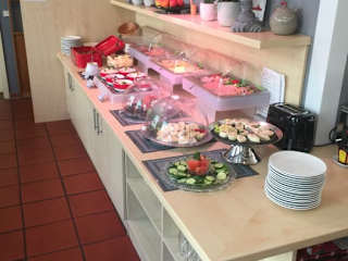 Sehr geschmackvolles Frühstücksbüffet, mit großer Auswahl an Aufschnitt, Käse, frisch zubereiteten Salaten und Eierspeisen, selbstgemachter Marmeladen, Bio-/Müsliecke, Joghurts, verschiedene Brot- und Brötchensorten. Kaffee- und Tee soviel man möchte. Wasser und verschiedene Säfte, Obstsalat
