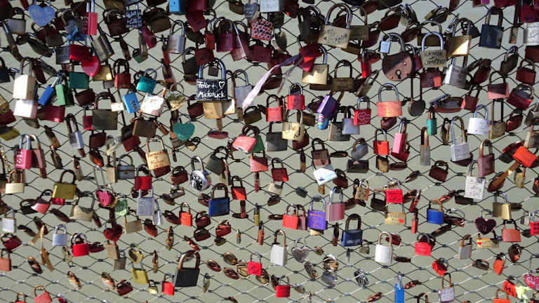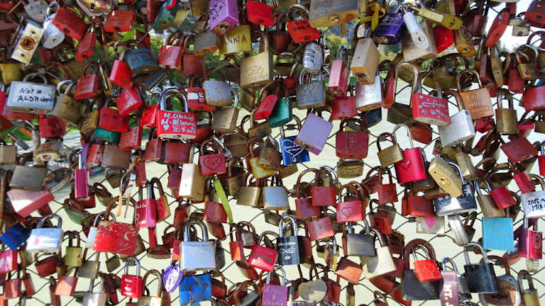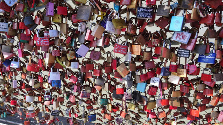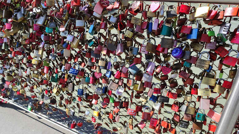 Die Fußgängerbrücke ist schwer beladen mit all den Schlössern, die an den Gittern befestigt wurden.