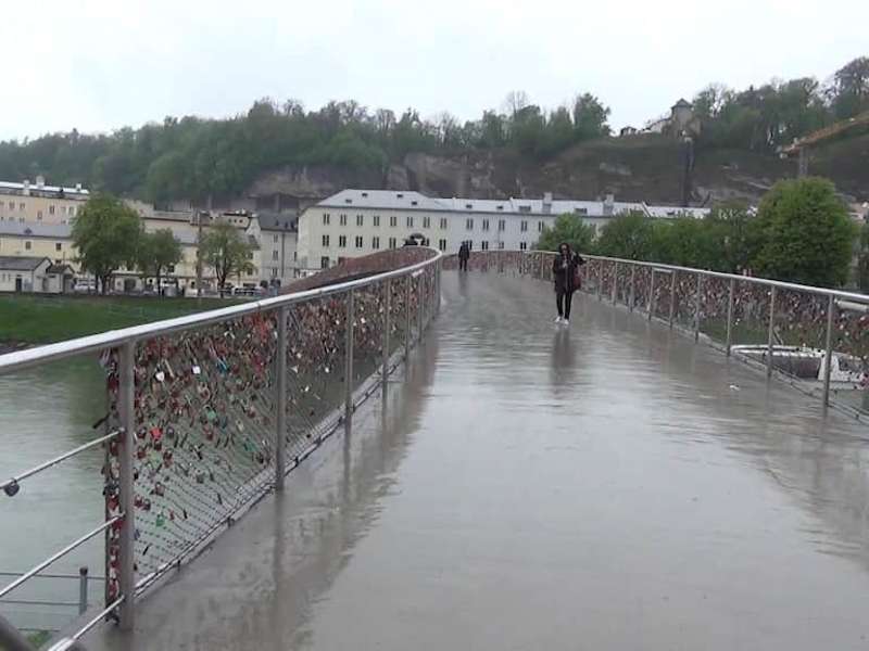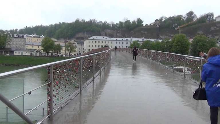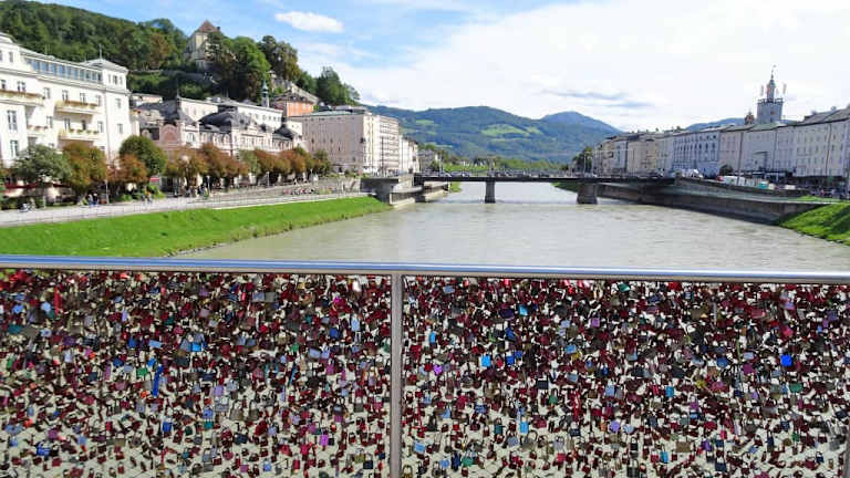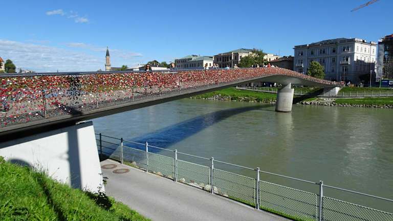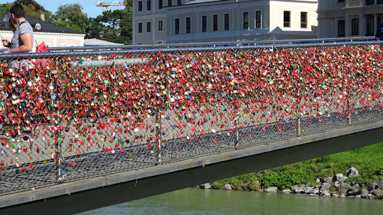 Im Salzburger Stadtgebiet gibt es inzwischen 13 Brücken, die den Fluss Salzach überqueren und eine davon ist der Makartsteg, der die Altstadt mit der rechten Neustadtseite verbindet. Nur für Fußgänger und Radfahrer zugelassen, schwingt sich die elegante Konstruktion über den reißenden Fluss: In der Mitte weist sie ihren stärksten Querschnitt auf, verjüngt sich zu den Ufern und wird nur von einem Pfeiler getragen, der sich auffällig gegen die starke Strömung neigt. Der erste „Makartsteg“, benannt nach dem 1840 in Salzburg geborenen Maler Hans Makart, wurde bereits 1905 in schönstem Jugendstil als Metallstreben-Konstruktion errichtet und war leider nach Jahrzehnten so durchgerostet, dass er bei einer Überprüfung im Jahr 1966 sofort gesperrt werden musste. In nur einem Jahr wurde ein Ersatz geschaffen, der auf den alten Pfeilern ruhte, aber erstens zu eng war und zweitens außerordentlich in Schwingungen geriet. Die heutige Konstruktion stammt aus dem Jahr 2001 und ist nicht nur elegant, sondern bietet auch ausreichend Platz für die 20.000 Menschen, die den Makartsteg täglich überqueren. Weniger die architektonische Schönheit, als vielmehr ein anderer Umstand macht den 110 Meter langen Makartsteg jedoch zum begehrten Fotoobjekt: Es sind die Zigtausend „Liebesschlösser“, die im stählernen Geflecht der Geländer aufgehängt wurden und deren Schlüssel mit der Strömung des Flusses auf ewig verschwunden sind – sie glitzern im Sonnenlicht wie Edelsteine und geben der Brücke einen ganz besonderen Charme.