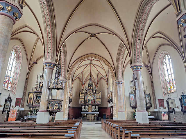 Die katholische Pfarrkirche Maria Himmelfahrt in Garmisch-Partenkirchen befindet sich im Ortsteil Partenkirchen in der Ludwigstraße 46. Eine erste Kirche in Partenkirchen gab es bereits im Jahr 1315. Im frühen 18. Jahrhundert wurde eine neue Kirche erbaut, die 1734 eingeweiht wurde. Diese Kirche fiel jedoch dem großen Stadtbrand vom 05.12.1865 zum Opfer (bei diesem Brand wurden insgesamt 67 Gebäude zerstört). Der Neubau der Kirche erfolgte zwischen 1868 und 1871. Im 20. Jahrhundert erfolgten mehrere Umbauten, neue Glocken wurden eingebaut. Weiter Innenrenovierungen und Außenrenovierungen folgten. Die Orgel wurde im 20. Jahrhundert zweimal ersetzt (1926/1927 und 1990/1991). Wenn man durch die historische Ludwigstraße läuft und sich die tollen Lüftlmalereien anschaut, so kommt man auch an der Kirche Mariä Himmelfahrt vorbei, die leicht erhöht oberhalb der Straße steht. Man sollte diese Kirche nicht nur von außen anschauen, sondern auch von innen. Dabei ist besonders der Hauptaltar interessant. Es ist ein Flügelaltar, der im offenen Zustand die Aufnahme Marias in den Himmel zeigt. Im geschlossenen Zustand sieht man die Kreuzigung Jesus. Die beiden Seitenaltäre sind ebenfalls interessante Flügelaltäre. Der linke Seitenaltar zeigt offen drei Heiligenfiguren (die Heilige Katharina, Maria mit Jesus auf dem Arm und die Heilige Barbara), geschlossen sieht man Jesus am Ölberg. Am rechten Seitenaltar sieht man (offen) das Bild der Pieta (die trauernde Maria mit dem Leichnam von Jesus auf ihrem Schoß), auf den Flügeln links und rechts den Heiligen Sebastian und den Heiligen Florian und (geschlossen) die Verspottung Jesus. Ansonsten findet man in der Mariä-Himmelfahrts-Kirche: Jesus am Kreuz, mehrere Heiligenfiguren, die Kanzel und einen schönen, geschnitzten Kreuzweg.