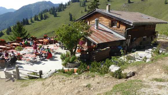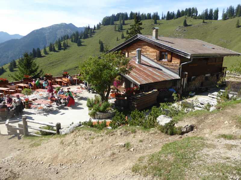 Die Wanderung zur Mariandlalm offiziell Trockenbachalm gehört schon fast zum Pflichtprogramm bei unseren jährlichen Herbstwanderungen. Die Mariandlalm liegt im Grenzgebiet zwischen Bayern und Tirol. Die Wanderung auf die Mariandlalm, beginnt kurz hinter der Grenze zwischen Bayern und Tirol bei einem Parkplatz (849 m) entlang der Straße. Der Forstweg zur Mariandlalm ist sehr gut beschriftet. Auf einer Werbetafel "Mariandlalm" sind die Öffnungszeiten der Almwirtschaft vermerkt. Laut Wegweiser sind es 1 1/4 Stunden Gehzeit bis zur Mariandlalm. Neben dem Wegweiser befindet sich eine Hinweistafel für Verhaltungsregeln für den Umgang mit Weidevieh. Zunächst verläuft der Weg auf einem Forstweg durch den Wald, von Beginn an ist der Weg leicht ansteigend. Rechts neben dem Forstweg floß ein kleiner Bach. Nach etwa 20 Minuten zweigte nach links ein schmaler Pfad ab, der mit „Mariandlalm 50 Minuten“ ausgeschildert ist. An dieser Kreuzung befand sich auch eine Ruhebank. Dieser Bergpfad stieg zuerst kurz steil an, führte dann entlang des Waldrands und anschließend am Hang der Bergwiesen weiter. Dieser Wiesenpfad führte uns hin zu einer Straßenbiegung wo man die Almhüten der Trockenbachalmen zum erstenmal sah. Es gibt die untere und die obere Trockenbachalm zu der die bewirtete Hütte zählt. Etwas tiefer liegen die Wirtschaftsgebäude der Trockenbachalm. Weiter wanderten wir den Pfad durch die Almwiesen entlang, bis wir wieder auf den Forstweg trafen. Wir folgten dann dem gut sichtbaren Steig, welcher die Forstraße querte und dann durch die Almwiese steil nach oben führte. Nach Erreichen der Forststraße waren es nur noch einige Meter bis zur Mariandlalm. Bis zur Mariandlalm benötigten wir in etwa die angegebene Zeit auf dem Wegweiser von 1 1/4 Stunden. Wir hatten auch diesmal wieder einen traumhaft schönen Herbsttag, wie fast bei allen unseren Wanderungen zur Mariandlalm. Auch diesmal suchten wir uns einen freien Platz auf der sonnigen Terrasse vor der Alm. Von der Terrasse hatte man einen herrlichen Ausblick auf die umliegende Berglandschaft und auf eine Kuhherde, die vor der Almwirtschaft weidete. Die Almwirtschaft Mariandlalm (Trockenbachalm befindet sich auf einer Höhe von 1250 Meter. Die Mariandlalm ist aus Holz gebaut und hat ein ausgebautes Dach, der Giebel ist nach Osten gerichtet. Die Almwirtschaft liegt auf der offenen Südseite des Trainsjochs mit herrlichem Blick nach Süden und Südwesten ins Gebiet des Veitsberges und des hinteren Sonnwendjochs. Die Mariandlalm hat Selbstbedienung. Das Essen wird in der Alm an der Theke bestellt und dann von einer Bedienung zum Tisch gebracht. Zur Begrüßung bekamen wir wie immer unser Schnapserl, diesmal einen Marillenschnaps von Hüttenwirt. Die Speise- und Getränkekarte lag bereits auf dem Tisch. Wir bestellten diesmal Kaspressknödel mit Salat und Preiselbeeren (8,50 Euro) und Kaiserschmarrn mit Preiselbeeren (8,50 Euro). Als Getränk bestellten wir po Person ein Leichtes Weißbier. Die Getränke und die Speisen wurden uns in kurzer Zeit von einem sehr freundlichen Kellner gebracht. Das Essen ist über die Jahre gleichbleibend sehr gut geblieben und die Wirtsleute (Christine und Stefan) bewahrten auch im grössten Streß die Ruhe. Auch die Preise für Getränke und Speisen sind für eine Almwirtschaft nach meiner Ansicht, absolut moderat. Nebenbei erwähnt, der Kaiserschmarrn mit Preiselbeeren wird als "Zahmer Kaiser" und der Kaiserschmarrn mit Preiselbeeren und Rum als "Wilder Kaiser", in der Alm bezeichnet. Der Kaiserschmarrn von der Mariandlalm wird von den meisten Gästen als der Beste in der Region bezeichnet. Sehr interessant fand ich den rustikalen Gastraum mit Kachelofen und die Theke. Eine Augenweide war auch der Blumenschmuck am Balkon des Hauses. An der Hauswand befanden sich zwei Hinweistafeln. Der Text einer Hinweistafel lautete: Ein Gipfel gehört dir erst, wenn du wieder unten bist. Denn vorher gehörst du ihm. Auf der anderen Tafel stand geschrieben: Es ist nicht der Berg, den wir bezwingen - wir bezwingen uns selbst. Man fühlt sich als Gast in der Mariandlalm wirklich willkommen und wir werden bestimmt mal wieder kommen. Als Abstieg wählten wir bis zum Parkplatz die Forststraße. Die Bergwiesen im Umfeld von der Mariandlalm sind beweidet. Heimische Rinder und die gutmütigen schottischen Hochlandrinder mit ihren weit ausladenden Hörnern und dem langem rostbraunem Fell befanden sich direkt neben der Forststraße bei den Almhütten der Trockenbachalm. Am Wegesrand entdeckten wir auch einige Pilze. Eine gemütliche Wandertour mit einer empfehlenswerten Almwirtschaft.