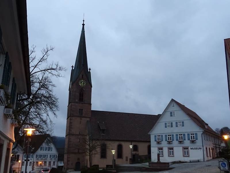 Vom Bahnhof Baiersbronn geht es ein steiles Stück nach oben bis nach Baiersbronn-Oberdorf. Seit der Reformation ist die Kirche evangelisch. Der heutige Bau stammt von um 1800, da der ursprüngliche Kirchbau im 18. Jahrhundert abgebrannt ist. Neben der Kirche befindet sich das Märchenmuseum und gegenüber das Rathaus.