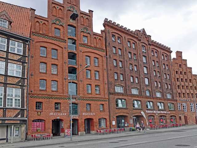 An der Untertrave 97 und 98 liegen 2 Häuser direkt nebeneinander, in welchen einmal ein Marzipan-Speicher-Café befindet und zum anderen der Marzipanshop genannt Marzipanland. Im Café finden sie eine sehr große Auswahl von Kuchen und Kaffeesorten, auch die berühmte Marzipantorte steht im Mittelpunkt. Diese ist garantiert keine Diät-Torte, der Rheinländer aber sagt auf Platt: die eet ick am leevsten. Das Café hat Selbstbedienung, macht aber kein Problem, kennt man doch von den Frühstücksauslagen in den Hotels. Im Nachbarhaus werden auf 400 m² unzählige Varianten des Lübecker Marzipan und auch Königsberger Marzipan angeboten. Spezialitäten wie Marzipan-Eierlikör, Pralinen und S chokoladen sind mir klar, aber was es mit Marzipanseife auf sich hat, ist nicht so ganz vertraut. Vieles wird auch als Mitbringsel für Famlienmitglieder eingekauft. Beachten sollte man in jedem Fall die herrlichen Backsteinfassaden der Häuser.