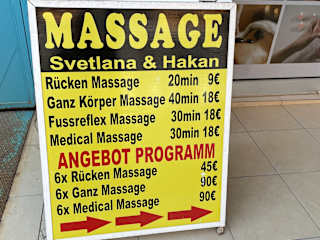 Wieder mal hervorragende Massagen bei Svetlana und Hakan genossen. Es ist immer wieder ein Traum. Wir gehen seit 17 Jahren in jedem Urlaub zu den beiden. Leider wird in der Türkei auch alles immer teurer und deshalb müssen die beiden nach vielen Jahren jetzt mal die Preise erhöhen. Ab Januar gelten die neuen Preise. Ein Foto mit den Preisen stelle ich unter Bilder ein. Wir bleiben den beiden treu, denn die Preise und die Qualität sind trotzdem kein Vergleich zu den Hotel Preisen oder gar zu Deutschland. Wir freuen uns auf Februar.
