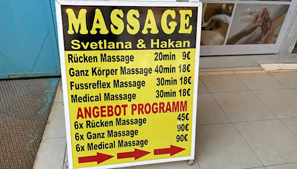 Die Massage bei Hakan und Svetlana heißt jetzt Therapie Massage Zentrum . Wir haben diese jetzt ausprobiert und sind begeistert. Mein Mann hat Ganzkörpermassagen und ich Rückenmassagen. Beide bei Masseur Yusuf. Absolut empfehlenswert. Tolle Nachfolge von Hakan und Svetlana. Tolles Preis-Leistungsverhältnis. Geht hin und probiert es aus.