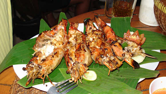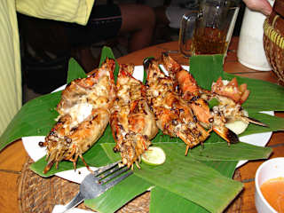 Wer Liebhaber von Meeresfrüchten ist, sollte unbedingt zum Fischessen an den Jimbaran-Strand fahren. Dort reiht sich ein Fischrestaurant ans nächste. Wir können das Menega Cafe empfehlen. Mit dem Taxifahrer einen Preis für Hin- und Rückfahrt aushandeln, so dass dieser am Restaurant wartet. Wir haben für 3 Personen von Sanur 150.000 Rp. gezahlt. Den Fisch bzw. die Meeresfrüchte selbst auswählen, sie werden nach Gewicht verkauft und anschließend gegrillt. Möglichst vor 17:30 Uhr dort sein, die besten Plätze unmittelbar am Meer, sind schnell vergeben! Bei Regen empfiehlt es sich nicht, dort hinzufahren, da die Plätze direkt am Meer nicht überdacht sind. Man kann auch telefonisch reservieren. Menega Cafe, Jl. Four Season Resort, Muaya Beach, Jimbaran, Tel. 62-361 75888