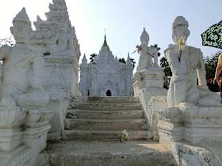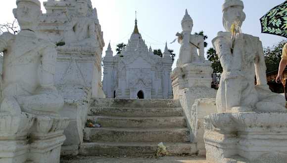 Mingun läßt sich gemütlich innerhalb von einem halben Tag von Mandalay aus per Boot besichtigen. Für die 11km den Fluss entlang braucht man ungefähr 1,5 Stunden und kann das Leben am Flussufer beobachten. Es steht nur der gewaltige Sockel der Mingun Pagode, die eigentlich die größe Pagode der Welt hätte werden sollen. Der Sockel ist ca. 50m hoch und wurde durch ein Erdbeben schwer beschädigt - die großen Spalten und Risse sind nicht zu übersehen. Der Aufstieg erfolgt über eine an der Seite angebaute Treppe. Wie überall müssen auch hier die Schuhe ausgezogen werden und je nach Tageszeit sind die Stufen und der Boden des Sockels glühend heiß. Einige Kinder verdienen sich etwas Geld, in dem Sie den Besuchern ein Bündel Blätter anbieten, die sie von den Büschen gepflückt haben, auf das man stehen kann, um den Ausblick trotz des heißen Bodens zu genießen. Der Ausblick lohnt sich, man sieht die weiße Hsinbyume Pagode, das Hinterland und den Fluss. Einige Minuten weiter die Strasse entlang, kommt man zur Mingun-Glocke, die mit 90 t die größte ihrer Art ist. Beim Erdbeben stürzte die Glocke ab, wurde aber nicht beschädigt. Auch die Besichtigung der Hsinbyume Pagode nochmals ein Stück weiter die Strasse entlang lohnt sich. Diese Pagode wurde von einem König als Grabmal für seine Lieblingsfrau gebaut.