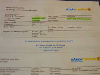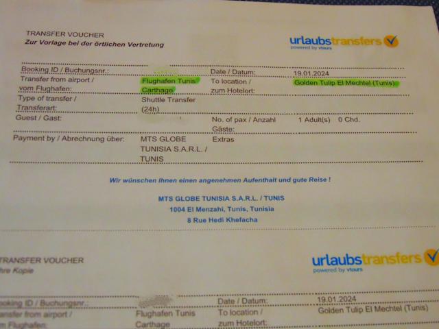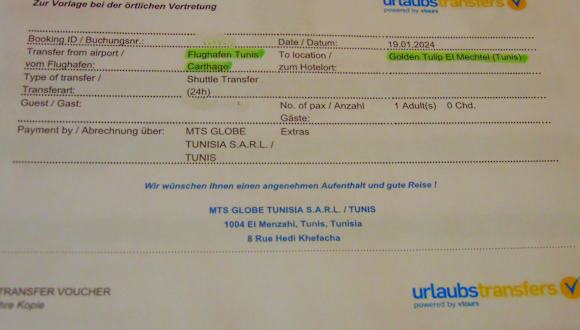 Seit einigen Jahren buche ich meinen Transfer vom Flughafen Tunis in die Stadt zu meinem gebuchten Hotel über www. urlaubstransfers. de und zahle für die einfache Strecke nur 8€ als sogenannten "Shuttle". Für meine neuerliche Reise im Januar 2024 buchte ich die gleiche Kategorie als Transport. "Shuttle" bezeichnet den Transport u. U. mit anderen Reisenden, welche zu ähnlichen Zeiten ankommen und man sie kollektiv "einsammelt" und zu ihrem Ziel fährt. Häufig bin ich in dieser Kategorie von Transport aber auch schon allein gefahren. Urlaubstransfers bzw. vtours arbeitet in Tunesien mit dem einheimischen Unternehmen "MTS Globe Tunisia" zusammen, die ich erneut wieder sehr empfehlen kann. Auch bei meiner letzten Anreise wurde ich wieder zuverlässig abgeholt und ebenso wieder sehr freundlich nach Ankunft durch Herrn Adin empfangen - einem der beiden Reps der Firma, der mich mittlerweile auch schon kennt. Auch der Fahrer war dieses Mal wieder freundlich und höflich. Dieses mal wurde ich - zusammen mit einem Ehepaar, die nach Sousse weitergefahren sind in einem 9-Sitzer abgeholt. Der Van hatte allerdings auch schon bessere Tage gesehen. Nach ca. 25 - 30 Fahrminuten kam ich wieder an meinem Hotel in Tunis an. Auch dieses Mal kann ich aufgrund dieser neuerlichen Erfahrung die Firma MTS Globe Tunisia ruhigen Gewissens weiterempfehlen.