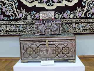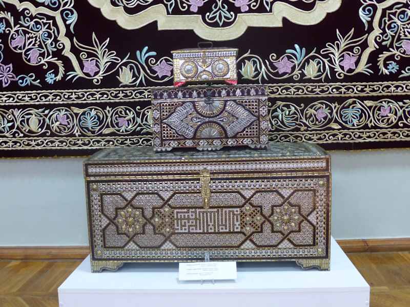 Ein weiterer Höhepunkt einer Stadtführung durch Taschkent ist das Museum für Dekorative und Angewandte Kunst. Das Gebäude ist eine alte Villa (1907 erbaut), die einem aus Russland verbannten Kaufmann und Diplomaten gehörte und als ein Meisterwerk der Architektur und Kunst der damaligen Zeit gilt, an dem bedeutende Künstler Usbekistans mitgearbeitet haben. 1938 wurde das Museum eröffnet. Von außen wirkt es zunächst erst mal eher unscheinbar. Man erreicht über einen typischen Innenhof, der zum Zeitpunkt unseres Besuches renoviert wurde, den eigentlichen Eingang zum Museum, dessen vordere Fassade mit Majoliken geschmückt ist. Hier kann man alle Gattungen des Kunsthandwerks aus dem 19. und 20. Jahrhundert bewundern: Keramik und Porzellan, Metallgefäße und andere Kunstwerke aus Metall, Stoffe, Stickereien und kostbare Wandbehänge mit farbenprächtigen Mustern in aufwändiger Stickerei (auch Vier-Generationen-Wandbehänge), Teppiche, Musikinstrumente, Schmuckstücke, Kleinmöbel und vieles mehr. Die Räume, in denen diese Werke präsentiert werden, sind durch die farbigen Fliesendekorationen, die bunt bemalten Holzsäulen und Decken, die aufwändigen geschnitzten Stuckarbeiten und die kleinen Nischen in den Wänden höchst beeindruckend. Man kann sich einfach nicht satt sehen an dieser vielfältigen Farbenpracht! Unglaublich!!! :-))