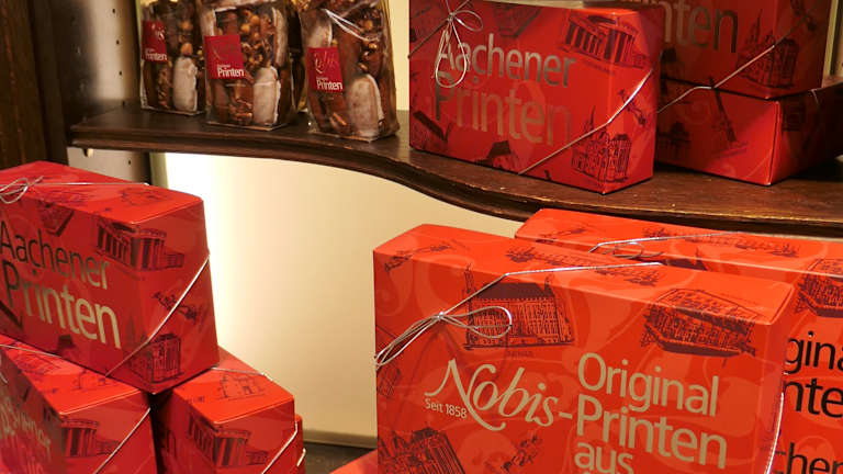Die Bäckerei Nobis ist berühmt für ihre Printen und unterhält in Aachen über 40 Filialen, in denen man nicht nur Brot, Brötchen und Feingebäck, sondern eben auch diese ganz besondere Lebkuchen-Spezialität der Stadt in vielen Varianten kaufen kann. Mein Favorit ist dabei die Filiale am Münsterplatz, in der es das Vollsortiment in allen Größen und in hübschen Verpackungen zu kaufen gibt: Kräuter-, Prinzess- und Schokoprinten, Weichprinten und Hausspezialitäten wie die „Domspitzen“, unter deren Schokoguss sich Printe und süßes Marzipan verbergen. Eine Besonderheit ist die gläserne Manufaktur, die sich etwas versteckt hinter dem Tresenbereich der Bäckerei befindet – hier wird der Printenteig vor den Augen des Publikums ausgerollt, in Form gebracht und auf den Backblechen verteilt – besonderes für Kinder ein großer Spaß!