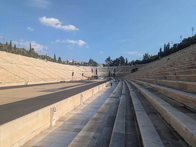 Das Stadion, hier endet immer der Marathon. Hier machte letztes Jahr Dior sein Defilee. Ein must see für Geschichte Interessierten. Gebaut wie ein Amphitheater, typisch griechisch.Man nennt es Kalimarmaro, schöner Marmor, hier fanden die ersten olympischen Spiele der Neuzeit statt. Man kann es besichtigen und eine Runde selbst laufen.
