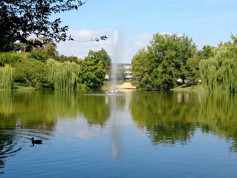 Der Ostpark in Landau wird im Volksmund auch Schwanenweiher genannt und liegt am Wege vom Bahnhof in die Innenstadt. Der ca. 3,5 ha große schön angelegt Park bildet die grüne Lunge in diesem Teil von LAndau. Der mittig gelegene See ist bevölkert mit vielen Wassertieren und die bekannte Festhalle von LAndau liegt am Rande des Parks.