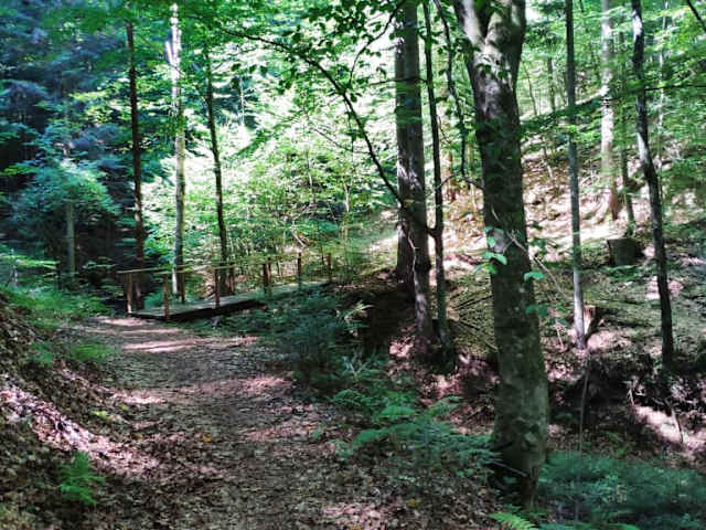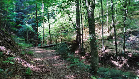 Dieser Rundwanderweg ab Bad Gams und zurück ( ca.9 km ) wird als Panoramarundweg Hohenfeld bezeichnet, wobei man nur im ersten Drittel ( Weinbergwarte ) ein Panorama mit schönster Aussicht auf die Weststeiermark genießen kann, denn beim zweiten Drittel des Weges gibt es keine Aussicht, man wandert nämlich nur durch den Wald. Aber auch dieser Waldweg bzw. Waldpfad hat seinen Reiz. Man geht durch einen dunklen Bergwald, auf Pfaden, überquert kleine Brücken und an Schluchten vorbei, immer nur bergab bis zum Ausgangspunkt ( Parkplatz "Kurpark" ). Bis zur Weinbergwarte und bis nach Hohenfeld geht es sehr steil bergauf. Höhenunterschied ca. 350 m. Ich würde diesen Wanderweg als mittel bezeichnen. Ich habe ca. 3 1/4 Stunden reine Gehzeit benötigt. Der Weg ist mit gelben Hinweistafeln in jeder Richtung sehr gut beschildert. Das Gehöft Grabenklug muß man unterhalb umgehen, den der Durchgang ist nicht gestattet.