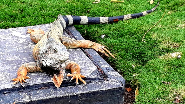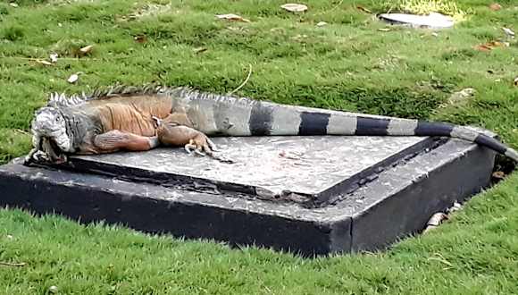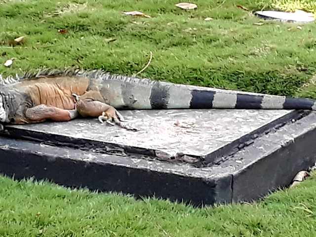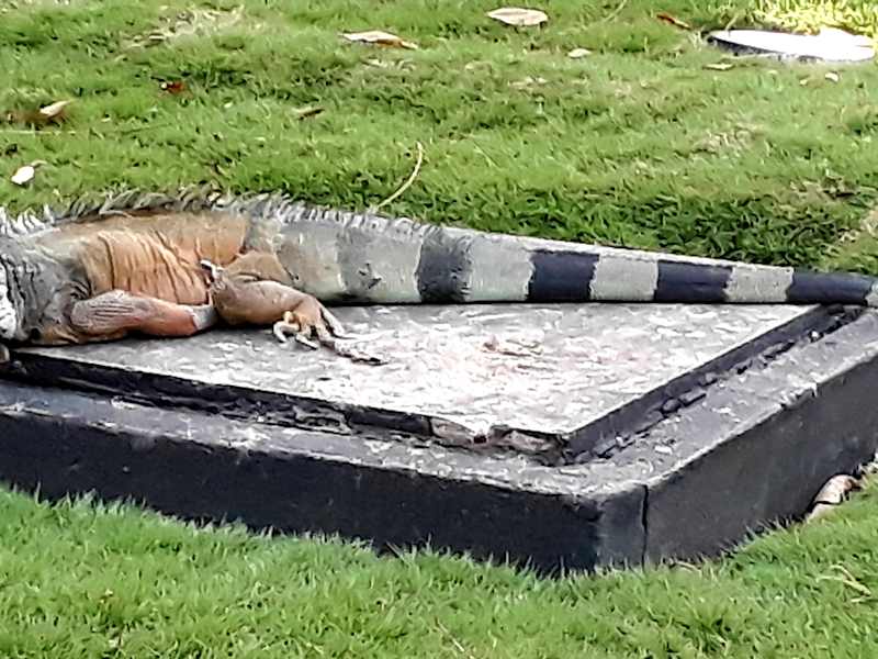 Vor der Kathetrale von Guayaquil gibt es einen kleinen Park, in dem sich viele Leguane verschiedener Größen aufhalten. Sie sind überhaupt nicht scheu, trotzdem sollte man vorsichtig sein, denn ein Biß kann schlimme Folgen haben, denn solche Bisse heilen schlecht. Die Leguane sitzen auch auf den Bäumen, deshalb immer einen Blick nach oben, denn es kommt oft vor das die Tiere urinieren oder koten und das ist dann nicht so toll wenn man so eine Ladung abbekommt.