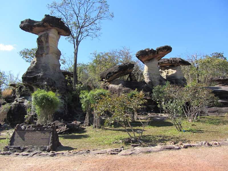 Wir fuhren von Ubon aus mit einem PickUp zum Nationalpark Pha Taem . Nach etwa 2 1/2 Stunden Fahrt kamen wir an den Parkeingang . Ausländer zahlen für den Parkeintritt 200 Bhat und Thais 40 Bhat . Bevor man dann zu den Cliffs kommt fährt man noch an einer recht bizarren Felsformation vorbei ( Sao Chaliang ) die man sich unbedingt ansehen sollte . Nach der Besichtigung des Headquaters macht man sich dann auf den Weg zum Cliff . Der Pfad führt entlang befestigter Wege mit diversen Aussichtsplattformen . Wir gingen bis zum 2ten Beobachtungspunkt ( hier sind die Felszeichnungen besonders schön und zahlreich . Vor den Zeichnungen wurde ein Drahtverhau installiert der verhindern soll das man hier hochklettert und die Zeichnungen zerstört . Nachdem wir wieder oben auf dem Plateau angekommen waren genossen wir noch die Aussicht über den Mekong nach Laos . Bei der Ausfahrt kommt man an einem Schild vorbei das , unter anderem auch in Deutsch , eine gute Fahrt wünscht . Bevor wir zurück nach Ubon fuhren machten wir einen Abstecher nach Khong Chiam um in einem Flußboot auf dem Mekong unser Mittagessen einzunehmen , Hier gibt es einen Aussichtspunkt von dem aus man den two colored River bestaunen kann . ( hier fliessen zum einen der braune Mekong und zum andern der blaue Mun zusammen ) . Alles in allem ein lohnender Ausflug von Ubon Ratchathni aus .