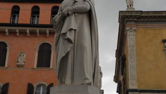 Mit schönen Palästen hatten die Scaliger den Platz der Herren ( Machthaber) umbaut. Auf dem großen Platz steht der überlebensgroße Dichter und Denker DANTE. Man geht von der Piazza delle Erbe durch den Palazzi dei Giudici , Justizpalast, in welchem die Richter aus Venedig Recht sprachen zu ihrer Zeit. Rechts davon steht der Palazzo del Comune von 1194, sowie der Torre dei Lamberti von 1365. Auf der Gegenseite steht der Palazzo del Governo, man erkent ihn an seinem Zinnenkranz. Direkt neben diesen dunkleren Gebäuden, bauten die neuen Herren aus Venedig die sehr gefällige Loggia Fra Giocondo, mit den bunten Verzierungen zwischen den Fenstern.