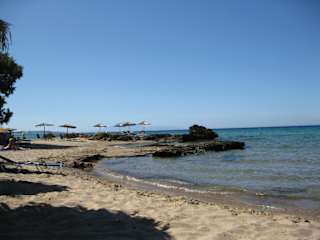 Es gibt in Griechenland KEINE Privatstrände !!! Jedermann/frau kann sich überall (!) am Sand hinlegen und geniessen. Das ist Gesetz! Richtig ist, dass der Strand sehr schön ist. Leider wird der Strand von einem Griechen bewirtschaftet (Liegen und Schirme) der von Gastlichkeit nichts hält. Sein Sohn (Typus Disco-Rausschmeisser) hat uns in äusserst agressiver Weise klar gemacht, dass hier nur (am Sand wohlgemerkt - wir wollten uns nur mal kurz im Meer erfrischen) liegen darf, wer seine Gebühren bezahlt. Wir wollten keine körperliche Auseinandersetzung riskieren und sind wieder gegangen. Wir haben dann auch von anderen gehört, dass solche Vorfälle an diesem Strand alltäglich sind. Also: Diese Vorgangsweise ist gesetzlich in ganz Griechenland verboten. Und solche "Gastgeber" sollte man nicht noch mit "Strandgebühren" belohnen! Das nächste mal würde ich den Vorfall bei der Polizei anzeigen. Trotzdem: Es gibt gott sei dank auch andere Griechen und der Strand ist wirklich sehr schön ...