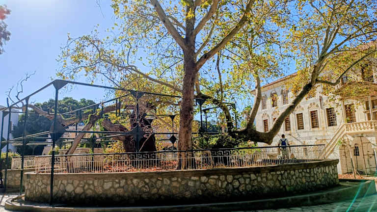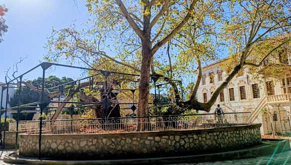 Die Platane soll 2400 Jahre alt und von Hippokrates gepflanzt worden sein, wohl als Schattenspender seines Open-Air-Lehrsaales für klassische Medizin. Später soll der Apostel Paulus an selbem Ort das Christentum gelehrt haben.