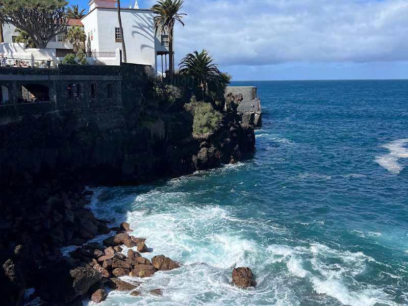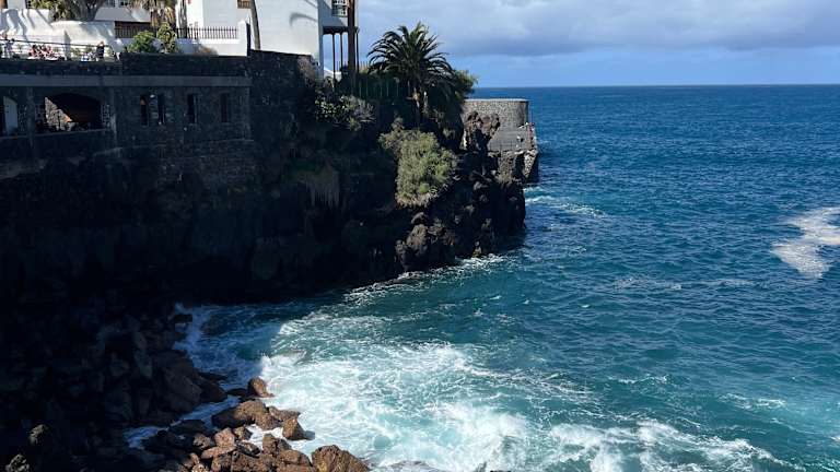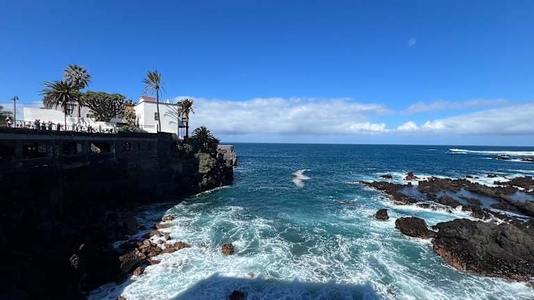 Die Playa de Martiánez im Westen von Puerto de la Cruz hat nicht nur einen schwarzen Sandstrand, sondern auch viele Steine. Im Wasser, vor dem Strand, befinden sich zudem Felsen. In der Bucht kommen große Wellen an. Die Strömungen sind unberechenbar. All das alles ist sicherlich keine Empfehlung für die Playa de Martiánez. Es ist sicherlich nicht der beste Strand. Aus Sicherheitsgründen würde ich hier nicht ins Wasser gehen. Man hat jedoch vom Strand aus eine tolle Aussicht auf den Atlantik und auf die Küste.