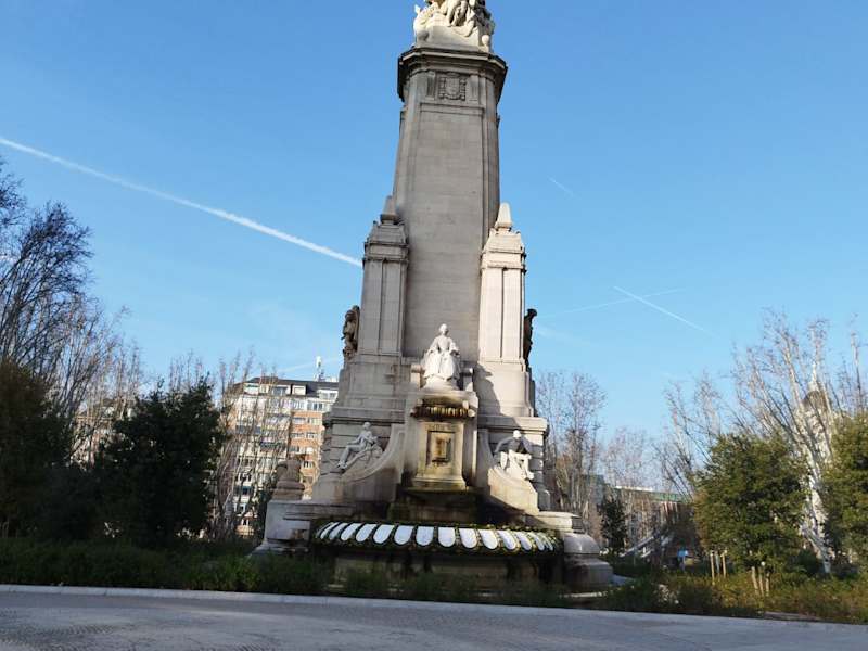 Die Hauptstraße Madrids, die Gran Via, endet an der Plaza de España, einer der verkehrsreichsten Kreuzungen der Stadt. Es ist ein Platz mit einem großen Brunnen und einem Denkmal Cervantes, der großen Figur der spanischen Literatur. Er wurde durch den Roman "Don Quixote" bekannt. Die Skulpturengruppe zeigt auch Sancho Pansa, der Don Quijotes Knappen im Roman war. Don Quijotes Dulcinea befindet sich auf der linken Seite zu finden. Da es sich um einen der zentralen Punkte von Madrid handelt, sind auch viele der wichtigsten Sehenswürdigkeiten und Attraktionen in der Nähe. Zwei der größten Gebäude der Stadt sind am Rande des Platzes, der Torre de Madrid (mit seiner Höhe von 142 Metern, eine Zeit lang das höchste Betonstrukturgebäude in Europa) und der "Edificio España", beide aus den 1950er Jahren.