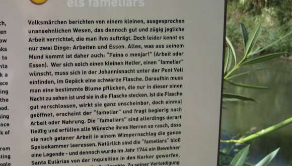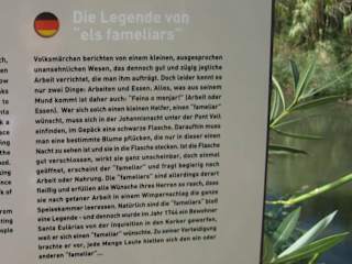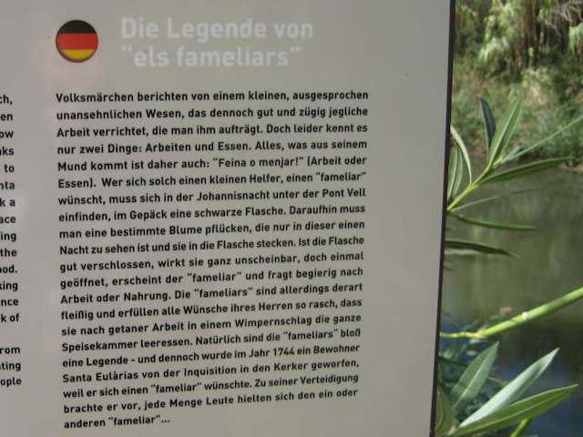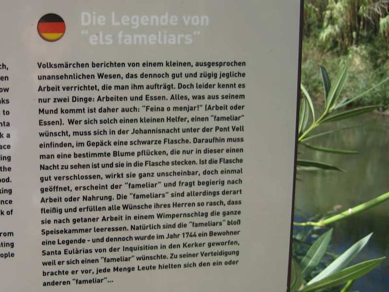 Die "Alte Brücke" / "Pont Vell" führt über den Riu de Santa Eulària. Man findet sie am Passeig del Riu - und diesen am südlichen Ende des Passeig Maritim (ist ausgeschildert). Es ist ein schöner Spaziergang und ein Blick auf die restaurierte Brücke lohnt sich auf jeden Fall. Ist eine wirklich hübsche Ecke, sehr schön gestaltet. Heute ist der "Pont Vell" eine Fußgängerbrücke. Für den PKW-Verkehr gibt es die direkt dahinterliegende "Neue Brücke" ("Pont Nou"), gebaut 1918. Die "Alte Brücke" wird auch „römische" Brücke genannt, allerdings scheint es für einen ersten Bau durch die Römer derzeit keinerlei Beweise zu geben. Erstmals wird die Brücke im 18. Jahrhundert erwähnt (um 1720). Sie war damals der Hauptzugang zum Ort Santa Eulària und musste somit wohl so einigen Piratenangriffen standhalten. Verteidigt wurde sie z. B. ab der Wehrkirche Puig de Missa, in deren Festungsanlage einige Kanonen bereitstanden. Es gibt eine nette Legende zum "Pont Vell", die in Gänze auf dem anliegenden Foto nachzulesen ist. Hier eine kürzere Fassung: Wer sich eine Arbeitshilfe wünschte, ging in der Johannisnacht mit einer schwarzen Flasche unter die "Alte Brücke", pflückte eine bestimmte Blume, die nur in dieser Nacht zu sehen war und steckte sie in die Flasche. Solange die Flasche geschlossen blieb, passierte nichts. Wurde sie geöffnet, erschien ein etwas hässlicher „fameliar“. Dieser erledigte dann fix die ganze Arbeit, aber… seine Bedingung war „Feino o menjar“ (Arbeit oder Essen). Und so konnte es dann vorkommen, dass der unersättliche „fameliar“ schon mal nach der Arbeit die ganze Speisekammer leerte. Eine Legende – klar. Dennoch wurde wohl 1744 ein Bewohner von der Inquisition in den Kerker geworfen, weil er sich einen „fameliar“ wünschte. Zu seiner Verteidigung brachte er vor, dass viele sich einen „fameliar“ hielten. Wer weiß… :-) (Quellen: Infotafeln vor Ort bzw. "Mapa de Santa Eulària" (Karte in der Touristen Information von Santa Eulària erhalten)