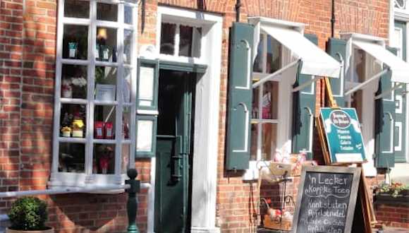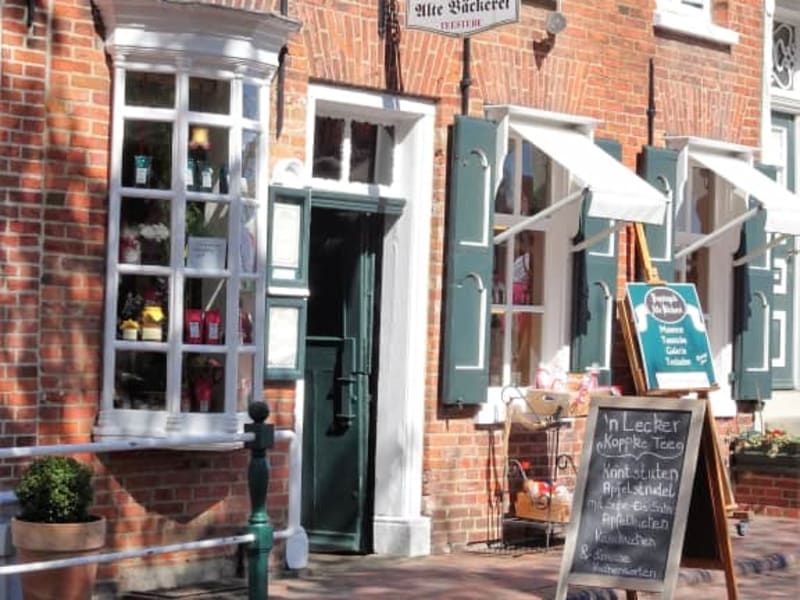 In Greetsiel am Hafen gibt es eine ganz entzückende Teestube. Schon wenn man eintritt umhüllt einen der wunderbare Duft der vielfältigen Teesorten die es hier gibt. Im Erdgeschoß befindet sich das Ladenlokal wo man frischen Tee und weiteres kaufen kann. Im Ober- und Untergeschoß befinden sich die Gaststuben. In der unteren Gaststube die richtig urig und gemütlich eingerichtet ist befindet sich sogar ein Butzenbett( in die Wand eingelassenes Bett das sich wie ein Schrank zuklappen läßt). Im anschließenden Raum ist ein kleines Museum eingerichtet, hier kann man Gerätschaften anschauen die früher in der alten Backstube gestanden haben. Im Außenbereich ist noch ein netter Biergarten wo man unter Bäumen schön sitzen kann. Ein Besuch in der Teestube ist für uns ein Muß wenn wir in Greetsiel sind.