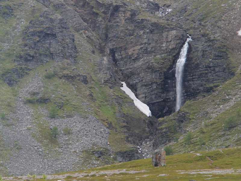 Wir legten unsere Mittagspause in einer Bucht am Porsangerfjord in der Nähe der kleinen Ortschaft Lakselv ein. Der Porsangerfjord ist mit einer Länge von über 120 km und einer Breite von 10 - 20 km einer der größten Fjorde Norwegens. Seine Ufer sind kaum besiedelt. Lakselv ist das größte Dorf und Verwaltungszentrum der Gemeinde Porsanger. Das Dorf liegt am südlichen Ende des großen Porsangerfjord Die Europastraße E06 Autobahn führt durch das Dorf. Die Gegend um Lakselv ist bekannt für Lachs , Forelle , Saibling und Äsche. Dieser Rastplatz am Porsangerfjord ist vor allem bekannt durch seine aus Schiefersteinen aufgestellten Steinmännchen und den beschrifteten Steinen. Mit diesen Steinmännchen, verewigen sich angeblich die Reisenden mit dem Versprechen zukünftig wiederzukommen. Niemand zerstört mutwillig die aufgeschichteten Steinhaufen eines anderen. Bemerkenswert waren auch die Sprüche in verschiedenen Sprachen auf den Steinplatten. Andi und Paul schrieben auf eine Steinplatte: Andi und Paul auf den Weg nach Nepal 10.06.2015. Astrid und Micha schrieben folgendes: Magdeburg – Nordkapp – in drei Tagen ( Ihr Luschen ), Astrid + Micha 12.6. 2015. Auf einer anderen Steintafel war zu lesen: Eleni + Eugen, Anneros + Hermann waren auch mal hier 08.06. Auch unsere Reisegruppe hat sich am 04.07.2015 mit folgenden Text verewigt: Danke für diesen wunderschönen Tag. Leitner Gruppe. 04.07.2015 Oberhalb der Bucht standen zwei traditionelle Blockhäuser mit Grasdächern. Solche Grasdächer halten im Winter schön warm und im Sommer sind sie angenehm kühl. In einem der Blockhäuser befand sich ein Souvenirladen, indem man typische lappländische Souvenirs kaufen konnte, wie z.B. Rentiergeweihe. In der Bucht befanden sich auch ein Toilettenhäuschen und eine überdachtes Häuschen mit einer Wanderkarte. Das Gebiet vom Porsangerfjord ist durch seine arktische Wildnis sehr beliebt bei Wanderern. Optimistisch fanden wir einen Eiswagen am Rastplatz. Bei Nieselregen und etwa 10 Grad hatte kaum ein Reisender den Gedanken, sich ein Eis zu kaufen. Auf jeden Fall sollte man bei diesem landschaftlich wunderschönen Rastplatz eine kurze bzw. auch längere Pause einlegen.
