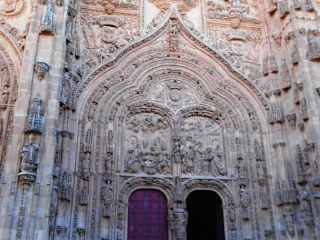 Hier wurde bei der Restaurierung der Neuen Kathedrale den Steinmetzen offenbar viel Freiheit gelassen, um auch moderne Ornamente in die Gestaltung des historischen Portals einzubringen. Das stark beschädigte Portal an der Nordseite, das im oberen Teil die Darstellung des Einzugs Jesu in Jerusalem zeigt, wurde 1991 anlässlich des 500. Jahrestages der Entdeckung Amerikas restauriert. Salamanca spielte eine wichtige Rolle bei den Plänen von Christoph Kolumbus, und die mit der Restaurierung beauftragen Steinmetze beschlossen, (wie Kolumbus) für Neues offen zu sein und integrierten neben traditionellen Motiven auch moderne Einflüsse in ihre Arbeit. Mit der Figur des Astronauten und einem Eis schleckenden Drachen gewann die Umrandung des Portals einen modernen Touch, der Besucher anzieht.
