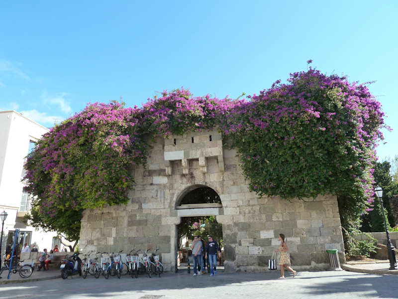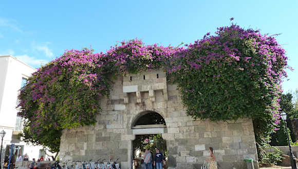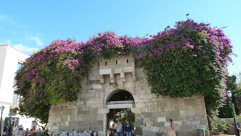 Das Tor gehört zur mittelalterlichen Stadtmauer und war der Zugang zur Agora von Kos . Dort mussten die auswärtigen Händler Zölle und Steuern entrichten . Heute wird es von prächtig blühenden Bougainvilleen umrahmt und ist der Eingang zur Restaurantmeile .