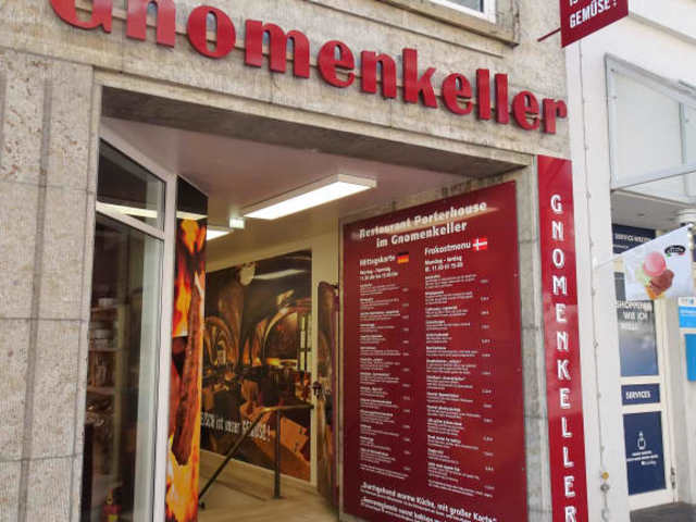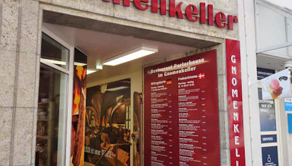 Ohne Frage: Als „Tempel veganer Esskultur“ taugt der Gnomenkeller ganz sicher nicht und folgerichtig steht das Motto in großen Lettern am Eingang: „Fleisch ist unser Gemüse“. Ich besuchte das Grillrestaurant an einem Abend unter der Woche und war angenehm überrascht: Durch ein nüchtern gehaltenes Treppenhaus gelangt man in die Tiefe und befindet sich dann plötzlich in einer anderen Welt: Die verschiedenen Gasträume werden durch ein denkmalgeschütztes gotisches Gewölbe überspannt, wobei warme Farben, Lichtinseln und die gewaltigen Pfeiler schon mächtig beeindrucken. Geboten werden im Gnomenkeller neben einem großen Salatbüffet in erster Linie Fleischspezialitäten vom Rind, Schwein und Lamm: Diverse Schnitzelvariationen, Rindersteaks vom Lavagrill, Roastbeef mit Bratkartoffeln, gemischte Grillteller – für Fleischliebhaber ist das Restaurant Porterhouse im Gnomenkeller ein kleines Paradies. Mein Besuch ist mir mit freundlichem Service, untadeliger Küchenleistung und dem außergewöhnlichen Ambiente in bester Erinnerung geblieben und meine Besuchsempfehlung ist ohne Einschränkung, sofern die gastronomische Stilrichtung zusagt.