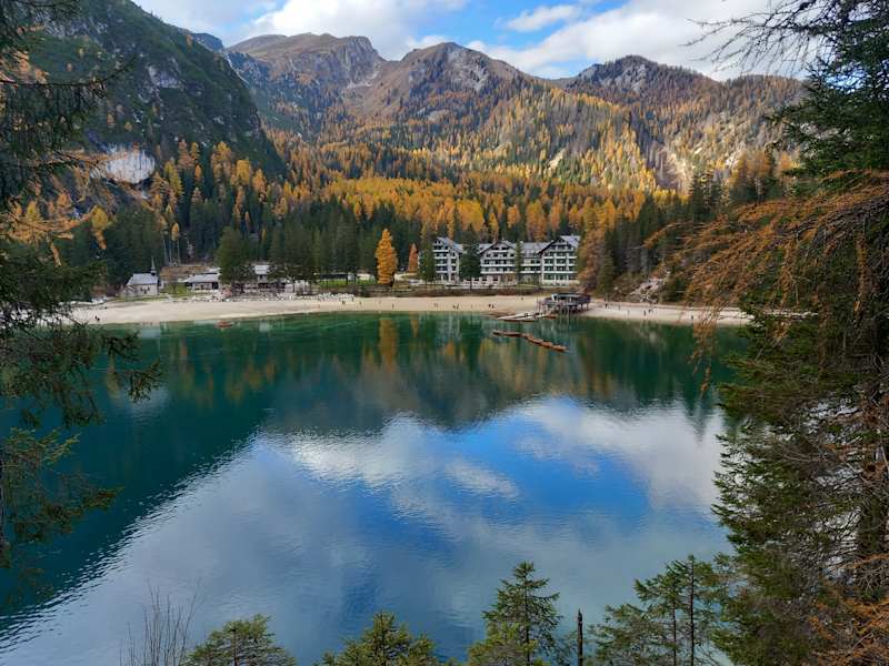 Wer den Pragser Wildsee ohne Menschenmassen genießen möchte, sollte morgens früh los. Bis 9:30 kommt man noch mit seinem eigenen Auto gegen hohe Parkgebühren auf das Gelände, ansonsten erfolgt die Anreise mit dem Bus. Ab 8 Uhr kommen die ersten Reisegruppen an, bis dahin sollte man die Seeumrundung also bereits erledigt haben. Der See selbst ist schön, es herrscht auch aufgrund der Spiegelung der Berge im Wasser eine mystische Atmosphäre und die Wanderung ist eine schöne Runde von ca. 4km mit dauerhaftem Blick auf den See. Vor allem durch die vielen Touristen, Hunde im Wasser und viele Stellen, an denen der See nicht so klar ist wie angepriesen, wurden unsere Erwartungen bei diesem Hype um den Pragser Wildsee zwar nicht ganz erfüllt, trotzdem handelt es sich um ein sehenswertes Ausflugsziel am frühen Morgen.