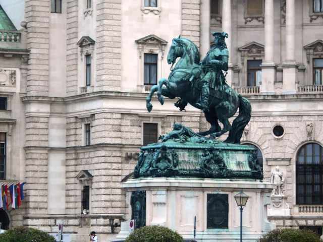 Auf dem riesigen Heldenplatz vor der Hofburg, stehen 2 gewaltige Denkmäler, aber uns soll im Moment das Denkmal des Prinzen Eugen von Savoyen beschäftigen. Wer war dieser Prinz ? Er wurde in Paris als jüngstes Kind einer adligen Familie geboren, er wollte unbedingt eine Laufbahn als Offizier einschlagen, jedoch der damalige franz. König lehnte ihn ab. Er trat in die Armee der Habsburger ein , obwohl damals mittellos. Schon in kurzer Zeit wurde er Offizier und konnte es im ersten Krieg der Österreicher gegen die starken Osmanen (Türken), die damals fast das gesamte Mittelmeer beherrschten, zum General aufsteigen. Um es zu konkretisieren, von Algerien über Ägypten, Israel, Syrien, Irak und Teile Irans, bis Bulgarien und Rumänien, sowie Ungarn war das Reich der Osmanen. In der Schlacht von Zenta an der Theiß gewann er die Schlacht 1697, dann im Jahr 1716 in den Schlachten von Peterwardein in Temesvar sowie in Belgrad besiegte er die Osmanen soweit, daß sie in Friedensverhandlungen zunächst Ruhe gaben. Insgesamt wurde Wien dreimal von den Türken belagert und immer ging er als Sieger, unterstützt vom Polnischen Heerführer, hervor. Kein Wunder daß er mit Ehrungen und sehr viel Geld von drei Kaisern überhäuft wurde, seine Schlösser und sein Winterpalais in Wien sprechen Bände.