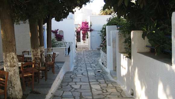 Pyrgos ist das größte Dorf auf Tinos und liegt ca. 30 km im Nordwesten der Inselhauptstadt. Es ist ein wirklich hübsches Dorf mit seinen Häusern, zwei Kirchen, Gässchen - alles im Kykladenstil und dem bunten Blumenschmuck. Da meine Vorschreiber bereits alles über Marmor, Museen, usw. geschrieben haben, möchte ich hier einzig – was den Marmor betrifft - den Marmorbrunnen auf dem schönen Dorfplatz erwähnen. Dieser Dorfplatz ist wirklich idyllisch, urgemütlich und erinnerte mich an den Dorfplatz von Mandraki auf der Insel Nisyros. Allerdings ist der Dorfplatz in Pyrgos größer und somit wird er nur teilweise von der sehr großen, schönen alten Platane überschattet. Gut gefallen hat mir in Pyrgos auch das „Honig-Geschäft“ und noch besser gefallen bzw. geschmeckt hat mir eine Honigart (man konnte probieren). Die habe ich dann auch erstanden, obwohl ich äußerst selten Honig esse. Sehr (!) lecker. :-) Noch zu erwähnen: Pyrgos soll der erste Ort gewesen sein, wo die griechische Flagge gehisst wurde, nachdem Tinos 1821 Teil des attisch-delischen Staates geworden war.