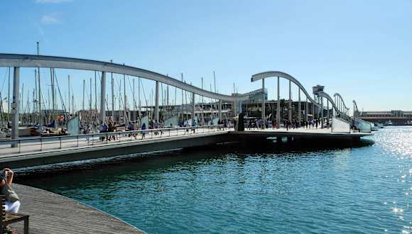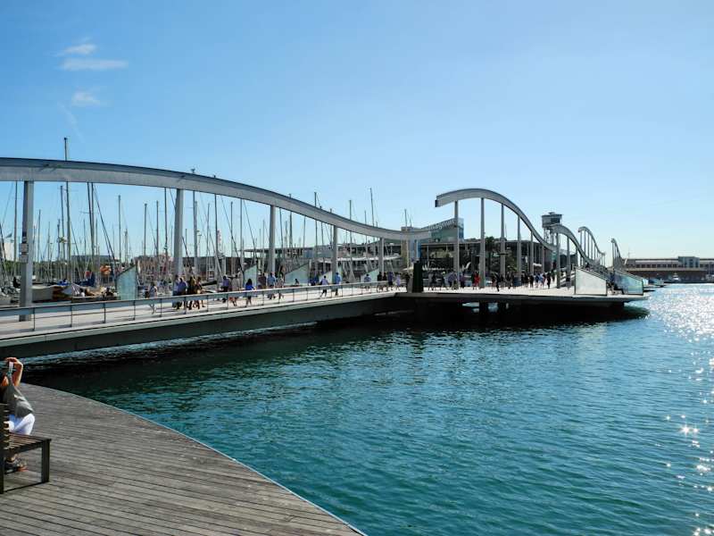 Die Rambla del Mar ist die Verlängerung der "normalen" La Ramblas. Über eine wellenförmige Holzbrücke kann man schön den Yachthafen von Barcelona über das Wasser überqueren. Es gibt einige Sitzbänke zum Verschnaufen und innehalten. Der Weg führt dann weiter zum Einkaufszentrum Maremagnum.