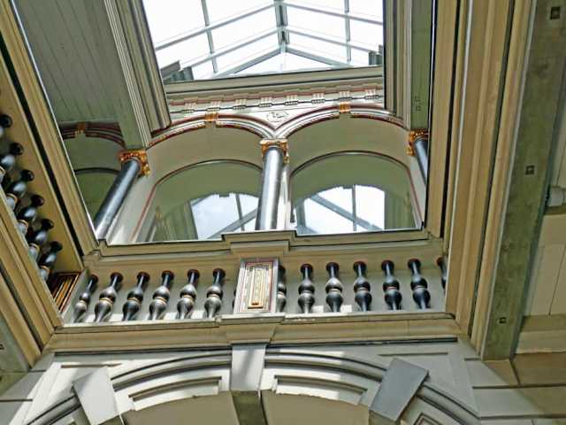 Im Innern des Rathauses gibt es zwei Laubenhallen und eine Galerie die vom Eingang Alter Markt zur Rückseite des Rathauses führt. Dieser Durchgang hat auch eine Galerie, diese ist aus Holz, sie hat 14 Säulen. In der Galerie findet man die Büste von Gustav II. Adolf von Schweden, der 1930 hier einen Besuch machte. Ab dem Jahr 1990 bekam die Galerie ein dauerhaftes Glasdach. Bei unserem Besuch spielt ein Musiker im Innern klassische Stücke.