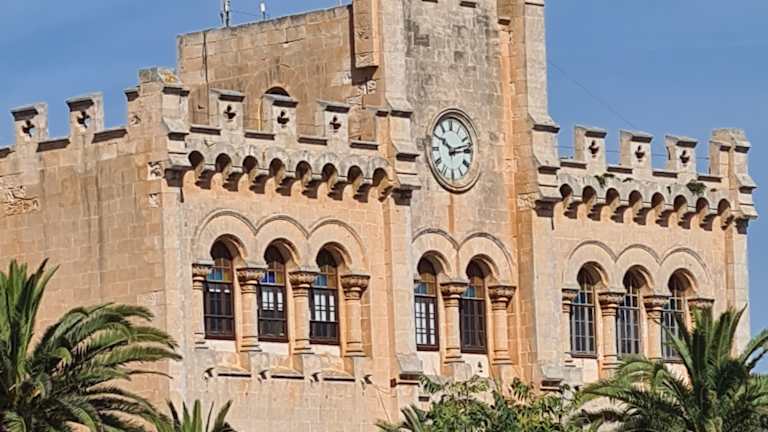 Das Rathaus von Ciutadella, Sitz der Stadtverwaltung, ist neben dem Adelspalast Cas Comte zweifelsohne das prächtigste Gebäude an der Plaça des Born und stammt - wie es sich heute präsentiert - von Ende des 19. Jahrhunderts. Es beherbergt neben der Stadtverwaltung auch eine Touristen-Information und eine der städtischen Polizeiniederlassungen (District Centre). Ursprünglich soll dort der Alcázar eines maurischen Herrschers gestanden haben, der allerdings nach der Eroberung der Insel durch Alfonso III. (1287) einem Gouverneurspalast weichen musste. Im 18. Jahrhundert verlor der Palast – und Ciutadella - an Bedeutung, als unter britischer Herrschaft der Gouverneur Richard Kane Mahón zur Hauptstadt erklärte und seinen Sitz nach dorthin verlegte. An den ehemaligen bedeutenden Gouverneurspalast und die Bastion von Ciutadella erinnert u. a. das Hinweisschild links des Rathauses, auf dem zu lesen ist: „Bastió d’Es Governador / Segle XVII“. Folgt man dem Schild, geht man um das Gebäude herum, eine Treppe hinauf und gelangt zu einer Art Aussichtsplattform (früher Teil der Bastion), die hinter dem Rathaus und direkt oberhalb der mächtigen Stadtmauern liegt. Ab dort hat man einen sehr schönen Blick über den Hafen bis hin zur Bastió de Sa Font (heute Museu Municpal).