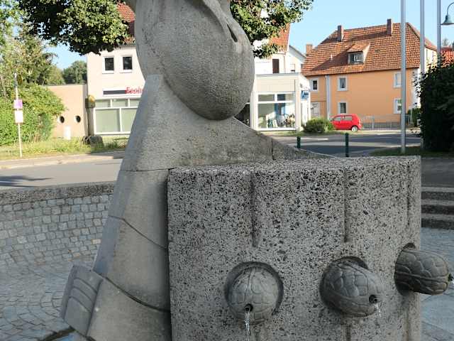 Im unterfränkischem Poppenhausen befindet sich vor dem Rathaus an der Ecke Hauptstra9e / Bahnhofstraße ein schöner Brunnen mit einer abstrakten Figur. Aus mehreren Wasserausgängen kommt Wasser, das in einem gepflasterten Wasserbett abläuft. Wir sind auf dem Weg zum Abendessen an diesem Brunnen vorbeigekommen, der uns durchaus gefallen hat.
