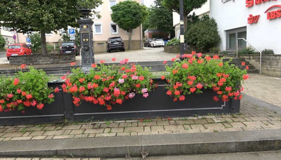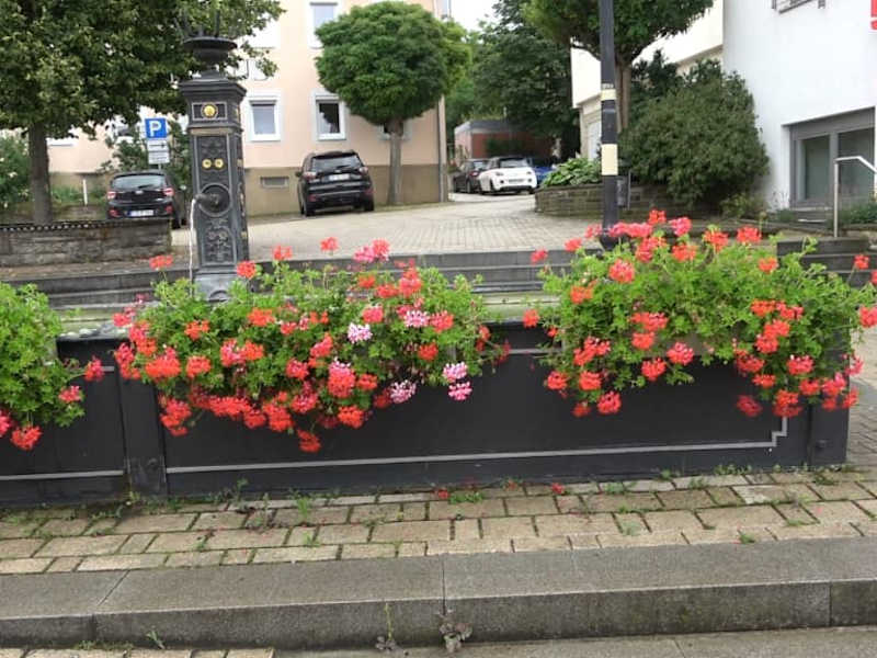 Auf dem Platz vor dem Rathaus steht ein sehr schöner Brunnen. Auf der linken Seite ist die Jahreszahl 2001 zu sehen. Zu diesem Zeitpunkt wurde er erneuert. Es ist ein rechteckiger Trog aus Metall. Zur Straßenseite sind Blumen in Blumengefäßen am Trog. Eine Säule, mit vergoldeten Verzierungen, bildet den Wasserspender.