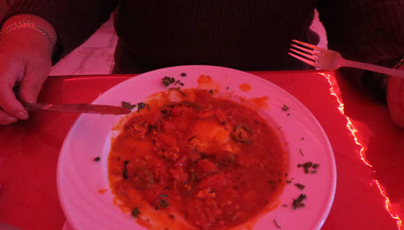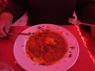 .... muß der Gast haben, der sich ein leckeres Essen im Restaurant Ali Baba gönnt. (Rue de 2 Mars ca 50 m weiter als das Magasin Carrefourt) Abends erwartet den Gast ein in Rotlicht getauchtes relativ großes Restaurant mit Außengastronomie. Eigentlich gemütlich, wenn die Wachstuchdecken auf den Tischen nicht wären. Uns wurden schnell die Speisekarten (arabisch und französisch) und die Getränke (nur alkoholfrei) gebracht. Hätten wir geahnt, was uns dann serviert wurde, wäre unsere Auswahl bescheidener ausgefallen. Auf Kosten des Hauses gab es eine sehr leckere Suppe und das obligatorische Baguette. Nach dem Genuß waren wir schon fast gesättigt, aber es warteten noch eine Vorspeise (Ojja mit Garnelen) und 2 Hauptgerichte (3 geteilete Calzone und Spaghetti Frutti di Mare) auf uns. Alles super lecker, nicht zu scharf aber typisch tunesisch gewürzt. Und riesige Portionen. Für mich war es zuviel, ich habe frühzeitig die Segel gestrichen. Schade drum. Das Essen wurde durch einen Thé Menthe vom Haus abgerundet. Die computergedruckte Rechnung zeigte uns den ungeheuren Betrag von 27 Dinar. Da bleiben keine Wünsche offen, zumal die Bedienung auch sehr schnell und freundlich war und auch die Toiletten sehr sauber waren.