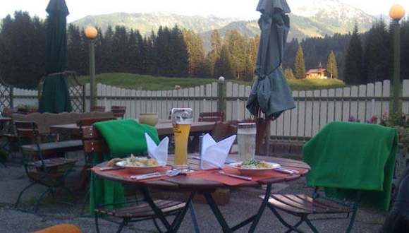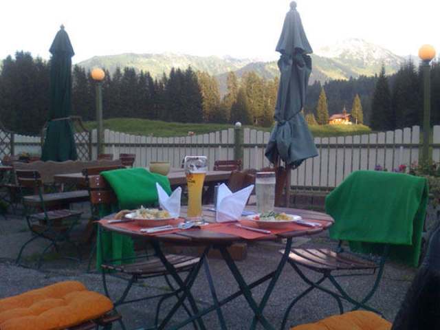 Nach einer Wanderung im Wäldele kann ich ein Abendessen oder eine kleine Mahlzeit im Hotel Küren empfehlen. Von dort aus läßt sich die Abendsonne Blickrichtung Kanzelwand wunderbar genießen.