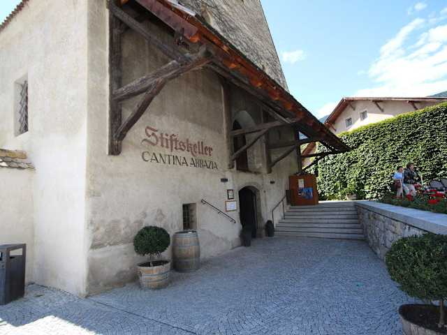 Im September 2014 suchten wir die kühlen Gewölbe des Restaurants und Cafés Stiftskeller bei hochsommerlichen Temperaturen auf. Tief im urigen Keller saßen wir bei schummrigen Licht unter dicken Mauern und wollten etwas Kühlendes zu uns nehmen. Die Getränkekarte der typischen Klosterschänke mit Biergarten bietet die eigenen Eisacktaler Stiftsweine (rot und weiß), die guten italienischen Obstschnäpse, Fruchtsäfte aus Holunder und Apfel und auch den Neustifter Kräutertee an. Von der Speisekarte kann man sich eine herzhafte Südtiroler Vesper mit Speck, Kaminwurzen und verschiedenen heimischen Käsesorten bei Südtiroler Schüttelbrot oder Brezeln zusammenstellen. Salatteller, Mehlspeisen wie Apfelstrudel, Buchweizentorte, Obstkuchen und Eisvariationen runden das Dessertangebot ab. Wir entschieden uns am frühen Nachmittag für eine Buchweizentorte und und einen Eisbecher mit Schlagsahne. Anschließend besuchten wir noch den im Jahre 2004 wiedereröffneten historischen Stiftsgarten zwischen den Weinbergen. Im hinteren Teil des Gartens befinden sich das begehbare Vogelhaus und ein turmförmiger Brunnen. Zu den Gartenanlagen gehören Obstgärten und Weinberge mit weißen Trauben. Der Stiftsgarten beherbergt etwa 75 verschiedene Arten, unter anderem Exoten wie Melonensalbei oder Tabak.