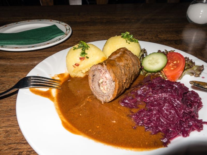 Geordert wurde : 1.Tomatencremesuppe 1 mit Käse- Croutons & Sahnehäubchen 3,90 € 2.Rinderroulade mit Rotkohl und Thüringer Klößen 13,90 € Die Tomatensuppe war sehr fruchtig und konnte auch in der Optik überzeugen . Eine Rinderroulade wurde serviert die augenscheinlich selbstgemacht war . Sie war sehr schnittfest gegart . Zur Füllung :Das Raucharoma des geräucherten Speck war etwas lasch .,die übrigen Komponenten hätten meiner Meinung nach etwas größer sein können . Mit der Soße waren wir geschmacklich sehr zufrieden , nur die Temperatur war unbefriedigend . Der Rotkohl aber insbesondere die Klöße waren sehr gut Der Service war ok . .