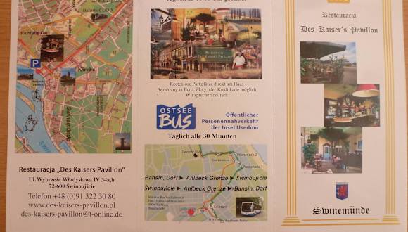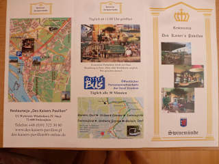 Das Restaurant liegt in der Nähe des Hafens am Wasser . Es gibt Sitzplätze im Restaurant , einige Tische direkt vor dem Lokal und über die Straße (Zebrastreifen) in einem abgegrenzten Terrain. Die Bedienung sehr freundlich und aufmerksam , es wird deutch und polnisch gesprochen. Bezahlung in Euro und Zloty sowie Kreditkarte möglich. Die Speisekarte sowei das Getränkeangebot abwechslungsreich . Ich aß Geflügelleber mit hausgemachtem Kartoffelpüree , Zwiebeln und Apfel. Mir schmeckte es sehr gut. Wartezeit auf das Essen angemessen , Preis-/Leistungsverhältnis stimmt absolut . Der Gastraum im Innern ist ansprechend eingerichtet und von der Größe her auch für größere Gruppen geeignet. Besonders hervorzuheben sind die Toiletten , welche sehr sauber sind! Insgesamt eine Empfehlung für "Des Kaisers Pavillion".