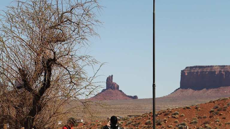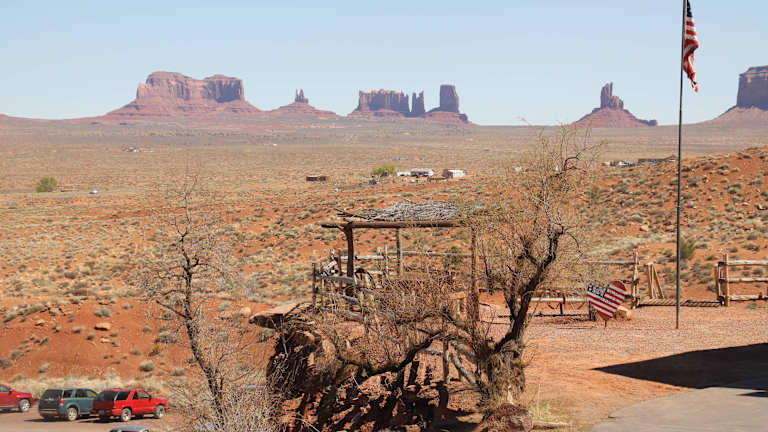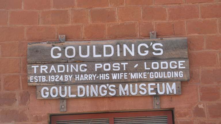 Nach unserer Jeepfahrt in Monument Valley fuhren wir mit dem Bus zur Goulding`s Trading Post. Goulding ist nicht weit vom Navajo Tribal Park entfernt. Die heutige kleine Siedlung wurde 1923 als indianischer Handelsposten Goulding’s Trading Post gegründet. Neben dem Restaurant gibt es auch einen Souvenirladen und ein Museum. Das kleine Museum erinnert an die Zeit der Filmhelden und zeigt Erinnerungsstücke von der Familie Goulding. Harry Goulding und seine Frau waren die ersten Weiße, die sich 1923 im Monument Valley niederließen. Beide bauten die Handelsstation und eine Herberge in der Siedlung auf. Harry Goulding war es auch, der 1938 den Hollywood-Regisseur John Ford überzeugte, im Monument Valley den Western „Stagecoach“ mit John Wayne zu drehen, und damit den Startschuss für die touristische Entdeckung der Gegend gab. Das Restaurant Goulding war sehr geräumig und schön eingerichtet. Besonders gefielen uns die Bilder an der Wand. Trotz der Nähe zum Monument Valley waren wir fast die einzigen Gäste im Restaurant. Das Mittagsessen gab es in Buffetform. Die Spezialität des Restaurants war die Navajo Taco, die man am Buffet abholen konnte. Navajo Brot oder „Frittiertes Brot“ ist eine Rezept der Navajo Indianer, welches vor allem im amerikanischen Südwesten sehr bekannt und beliebt ist. Die Navajo Tacos vom Goulding`s Restaurant waren sehr lecker. Die Auswahl der Speisegerichte war im Großen und Ganzen in Ordnung. Besonders groß war das Angebot an Salaten. Kaffee und Coca Cola waren im Preis inbegriffen. Der Service liegt in indianischer Hand. Im Restaurant besteht wie in allen Indianerreservaten absolutes Alkoholverbot. Ich kann das Restaurant Goulding weiterempfehlen. Nach dem Mittagessen besuchten wir noch den gegenüberliegenden Souvenirladen. Die Angestellte des Ladens war sehr lustig und gesprächig. Alte rostige Wagenräder am Zaun der Anlage erinnern noch an die Postkutschenzeit. Von der Terrasse des Restaurants hatte man einen spektakulären Blick auf die Felsen von Monument Valley.